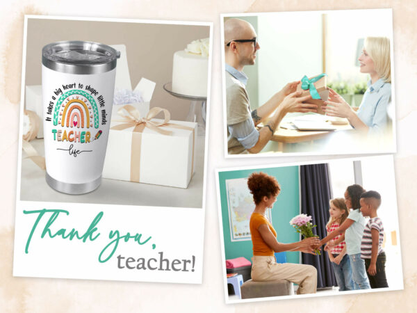 Our 20oz stainless steel tumbler makes an excellent gift for teacher who appreciate convenience, durability, and style. Its unique features, such as the spill-proof lid and double-walled insulation, make it a practical choice for various occasions while its stylish design adds a touch of elegance to any outfit. Whether it’s for Teacher’s Day, Mother’s Day, Birthdays, Christmas, or just because, our tumbler is the perfect way to show Teacher how much you care.